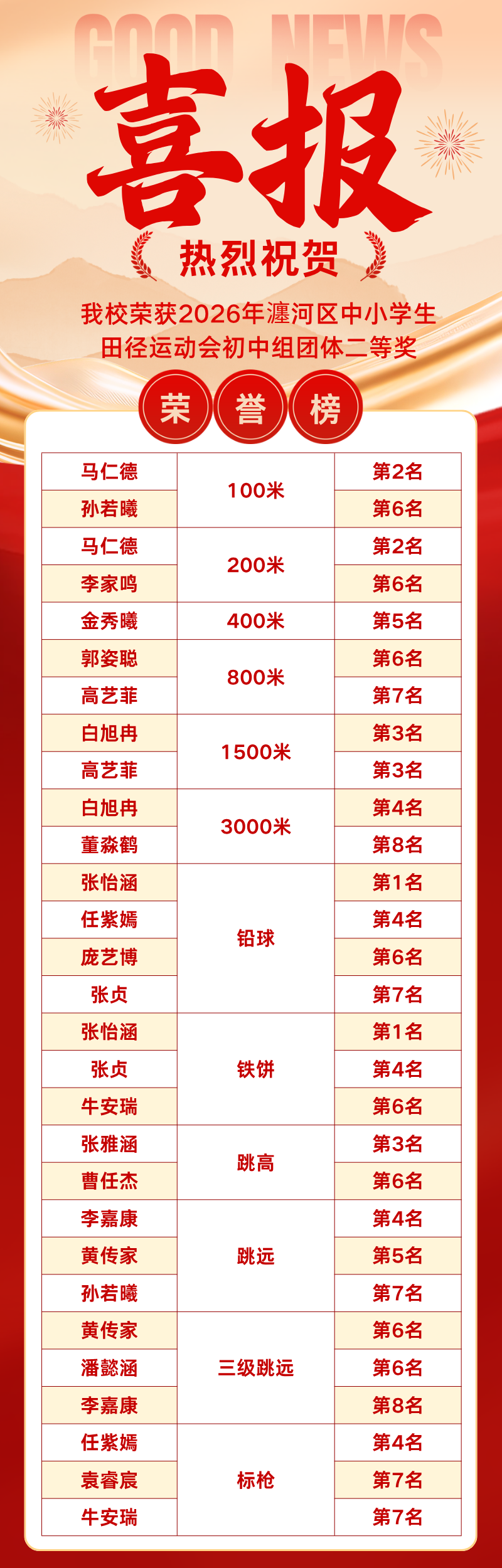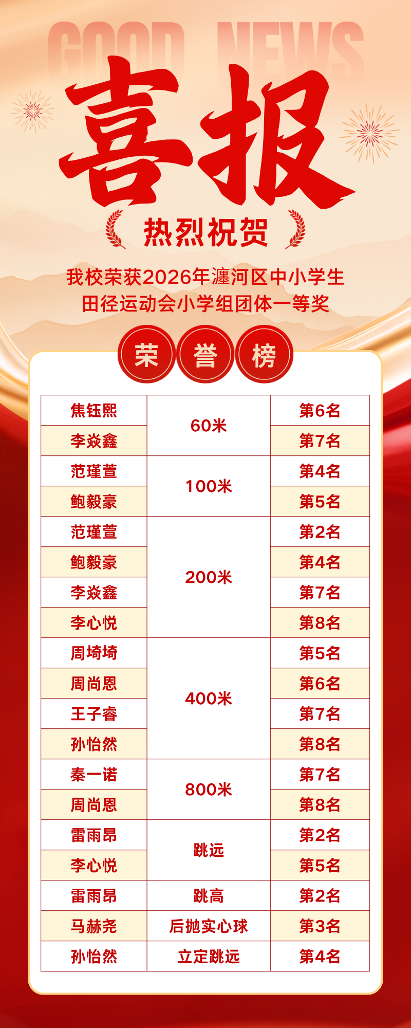 近日,2026年瀍河区中小学生田径运动会圆满落幕。我校运动健儿奋勇拼搏、团结协作,在全区多支代表队的激烈角逐中脱颖而出,荣获小学组团体一等奖、初中组团体二等奖,用汗水与实力为学校再添荣光!